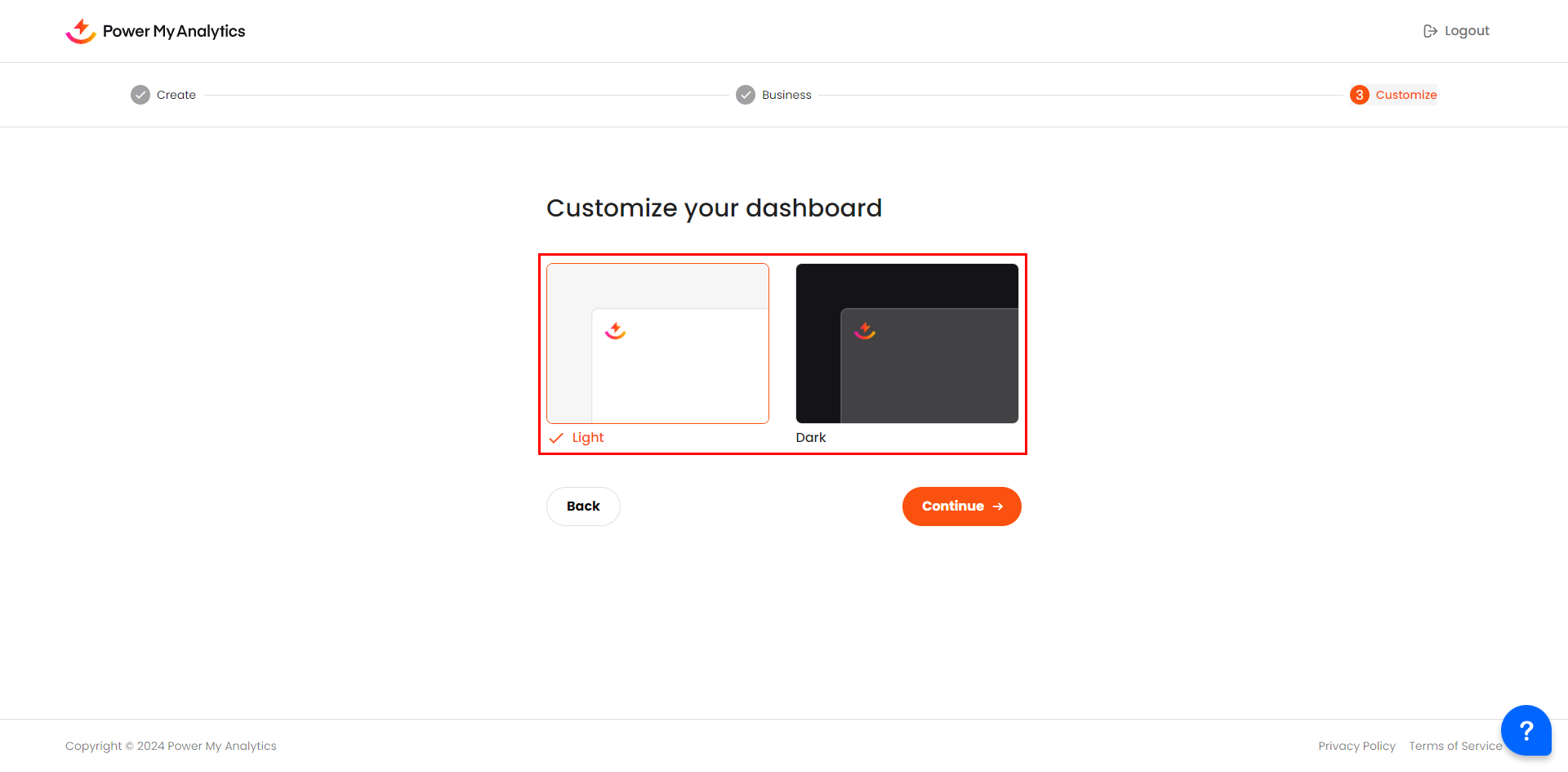 In this final step, personalize your Power My Analytics hub theme. Choose your preferred appearance: light mode or dark mode.