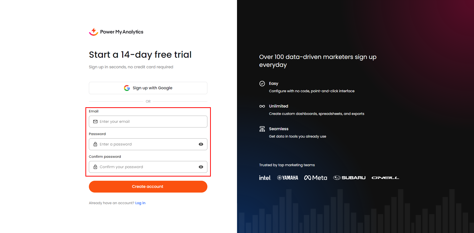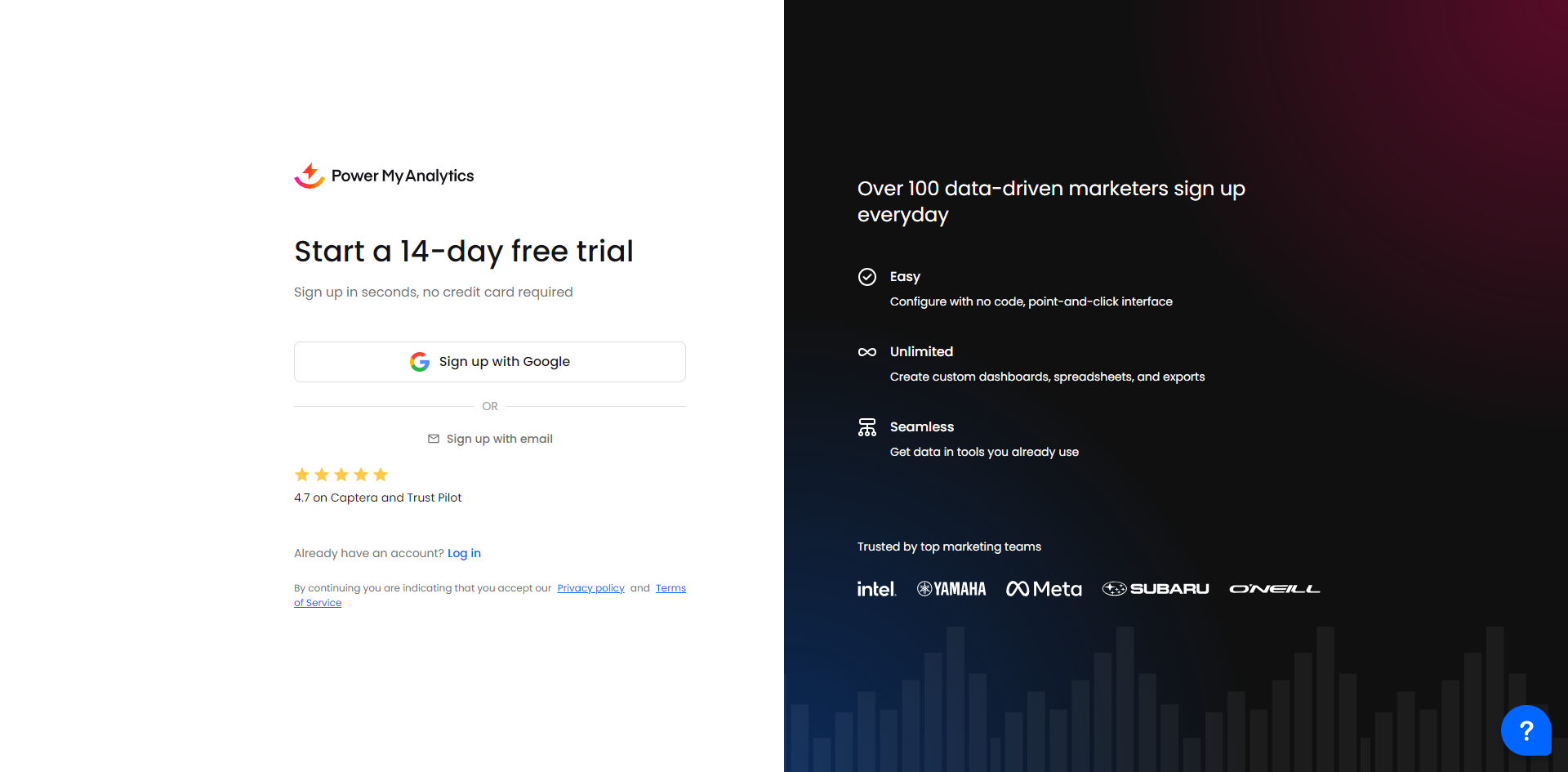 Navigate to https://hub.powermyanalytics.com/trial to begin your free trial. No payment information is required during your 14-day free trial. Choose your preferred sign-up method: