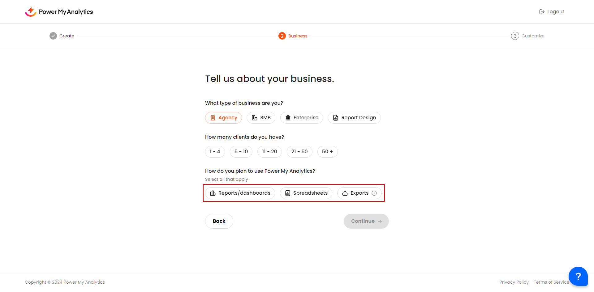 Click Continue to move to the next step. Tell us about your business by selecting one of the following options: