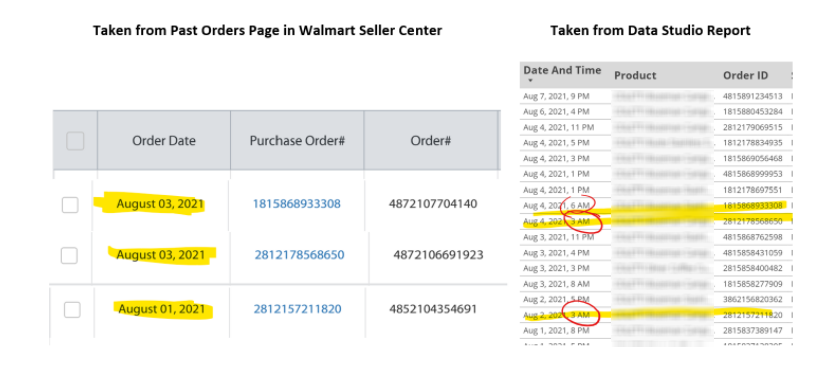 Time zones in report do not match time zones in Walmart Seller Center.