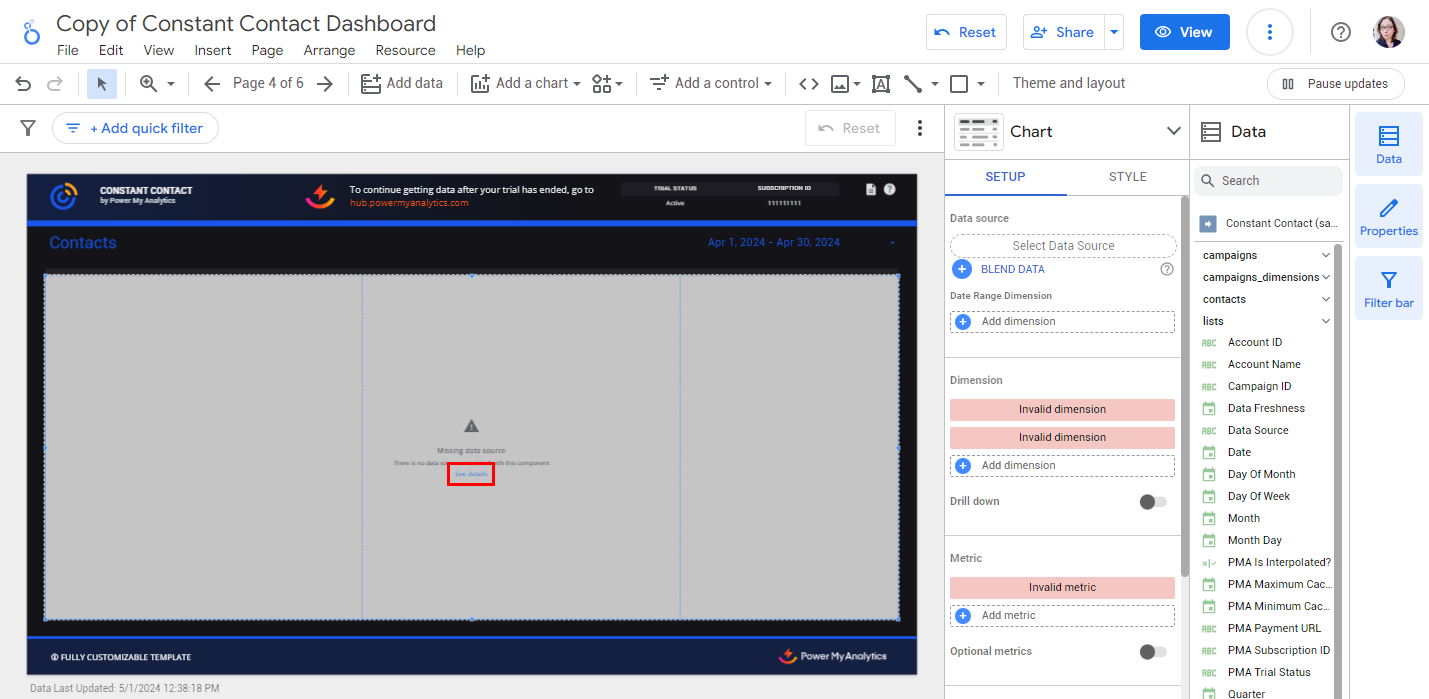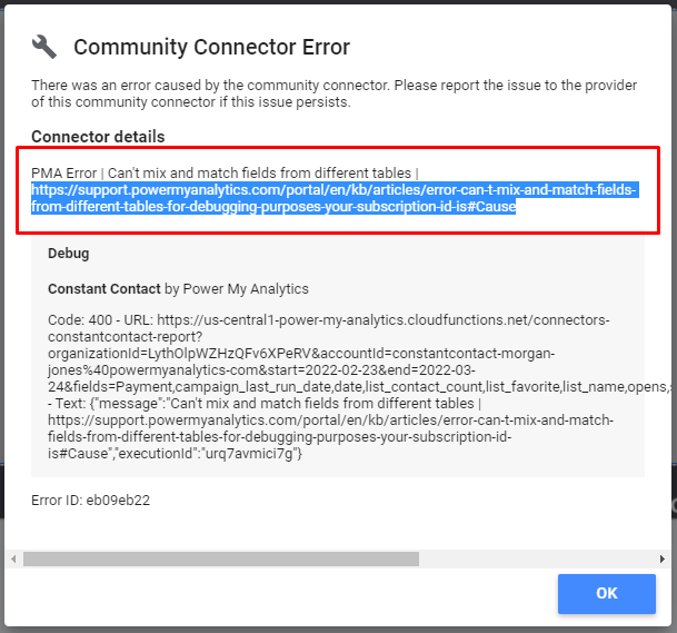 If your report was made with a Power My Analytics data source, most of the errors you see in Looker Studio contain helpful links to our own knowledge base.